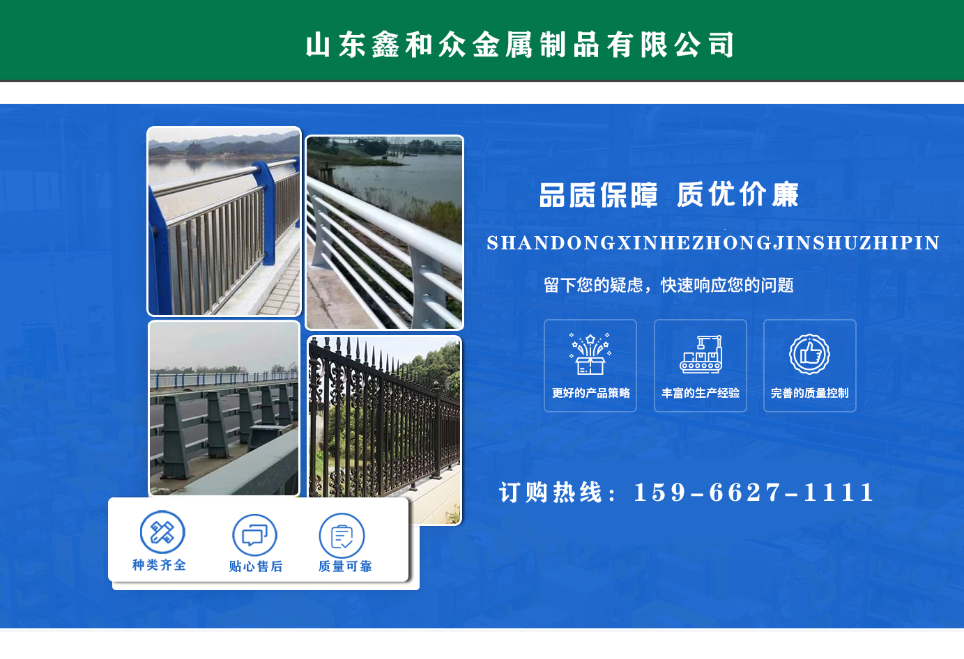 山東鑫和眾金屬制品有限公司主要產(chǎn)品有防撞護(hù)欄,橋梁護(hù)欄,道路護(hù)欄,河道護(hù)欄,不銹鋼護(hù)欄等護(hù)欄。提供設(shè)計(jì)方案,一站式定制,包您滿意價(jià)格優(yōu)惠,歡迎來電咨詢! 公司常年從事銷售護(hù)欄防撞護(hù)欄,橋梁護(hù)欄,道路護(hù)欄,河道護(hù)欄,不銹鋼護(hù)欄,橋梁鋼護(hù)欄,河道燈光護(hù)欄等。產(chǎn)品廣泛應(yīng)用于橋梁、河道、旅游景區(qū)、道路、公路、公園、小區(qū)、景觀、道路防撞等領(lǐng)域。 公司產(chǎn)品均采用優(yōu)質(zhì)不銹鋼材料,符合相關(guān)標(biāo)準(zhǔn)。各種型號不銹鋼復(fù)合管及護(hù)欄,質(zhì)量嚴(yán)格把控。產(chǎn)品強(qiáng)度高、耐腐蝕、焊接牢固、抗沖擊、性能好,防撞護(hù)欄結(jié)構(gòu)簡單、美觀實(shí)用大方?! g迎前來訂購!...